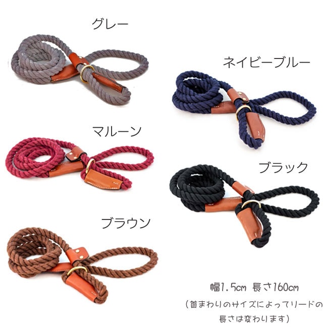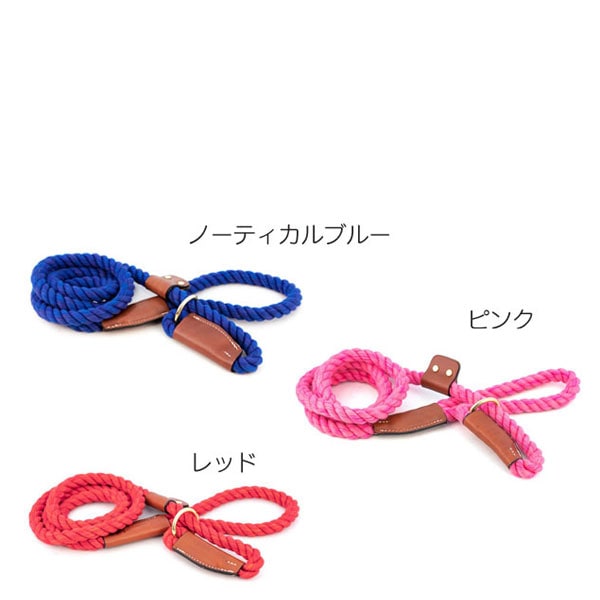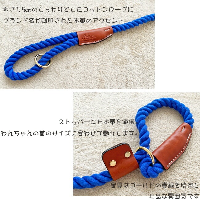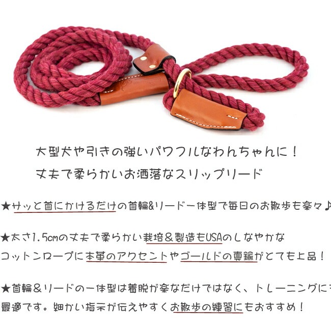 アメリカの老舗犬具メーカーAUBURNの柔らかく丈夫なコットンロープのスリップリードです。首輪リード一体型のためさっと首にかけてストッパーを下すだけの簡単装着。