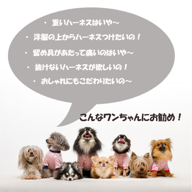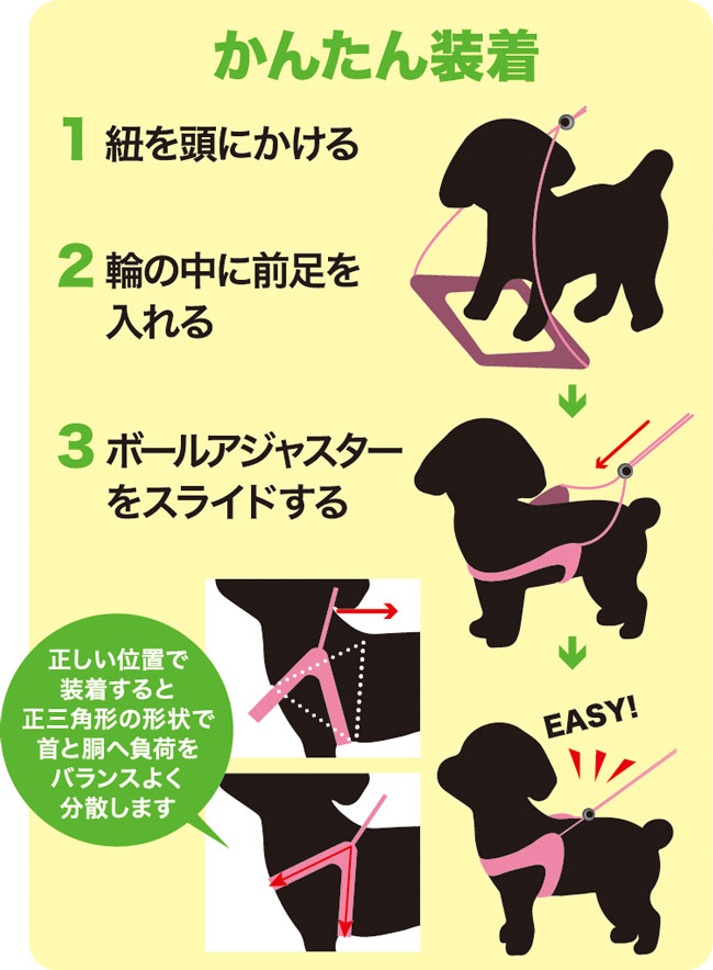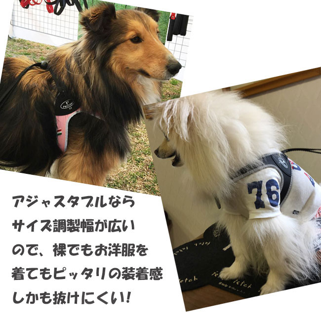 アジャスターでワンタッチでサイズ調節可能なため、様々な体型のわんちゃんにもぴったりフィットして、抜けにくいハーネスです。