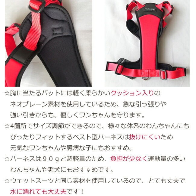 驚くほど軽い超軽量クッション付きハーネス。4箇所でサイズ調節可能のため、様々な体系のわんちゃんにぴったりフィットするため、抜けにくく負担の少ないハーネスです。引きの強い元気なワンちゃんはもちろん、軽くて柔らかいので、老犬にもおすすめ!