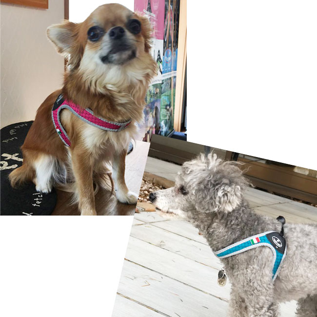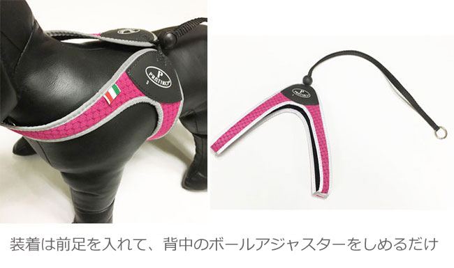 イタリア生まれの活気的なハーネス、装着するだけでサイズ調整ができてしまいます。抜けずらい上に裸でも洋服の上からもフィット抜群。軽いのでワンちゃんの負担になりません。