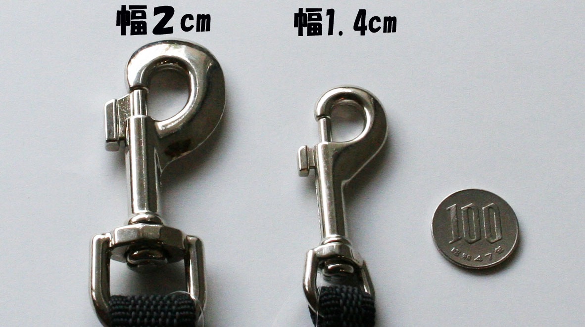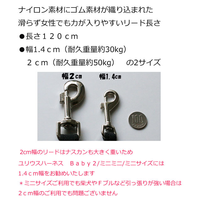![]() 長さ120cm 幅1.4cm (耐久重量:約30kg)と2cm(耐久重量50kg)の2タイプございます。 ![]() リードの幅によりナスカンの大きさが異なります。 2cm幅のリードはナスカンも大きく重いため ユリウスハーネス Baby2/ミニミニ/ミニ サイズには1.4cm幅をお勧めいたします *ミニサイズご利用でも柴犬やFブルなど引っ張りが強い場合は 2cm幅のご利用でも問題ございません |