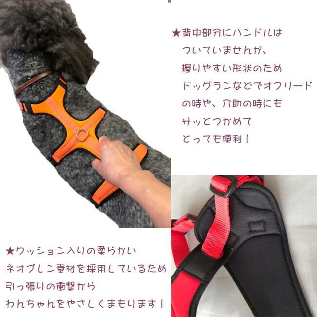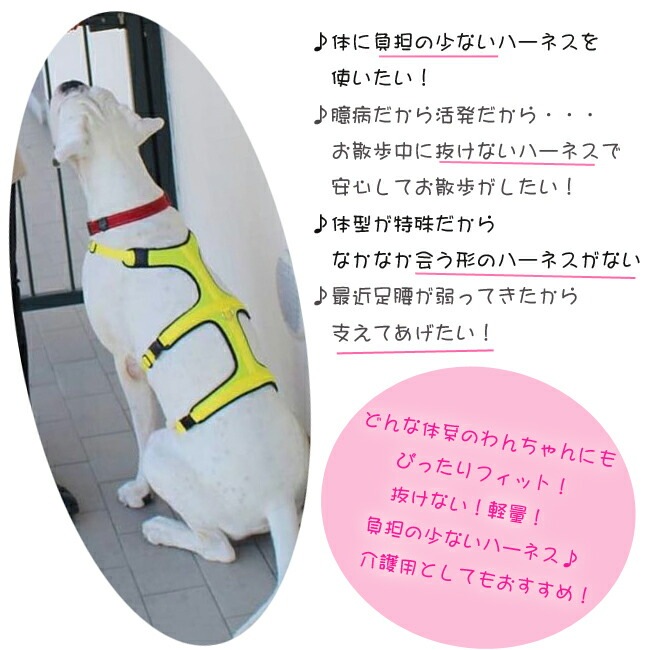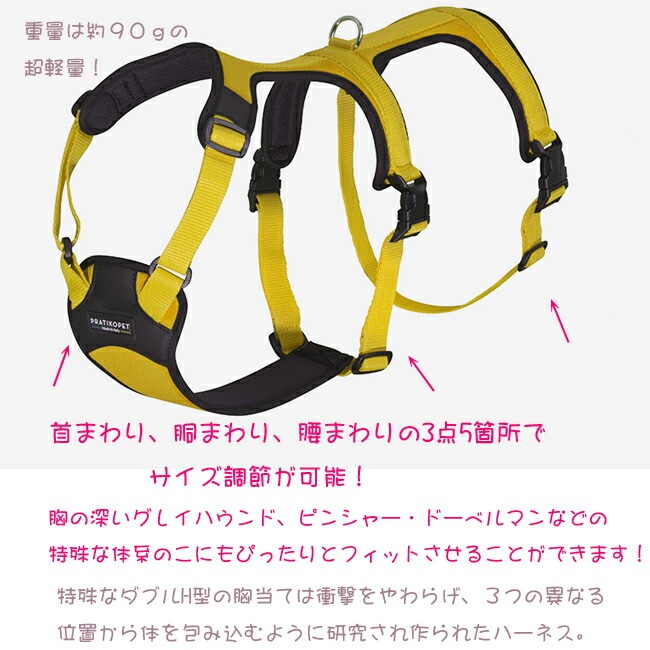 驚くほど軽い超軽量クッション付きハーネス。首まわり、胴回り、腰回りの3点で体を支え、5箇所でサイズ調節可能のため、様々な体系のわんちゃんにぴったりフィットするため、抜けにくく負担の少ないハーネスです。引きの強い元気なワンちゃんはもちろん、軽くて柔らかく体全体を支える特殊な形状のため、老犬の介護にもおすすめ!MADE IN ITALY