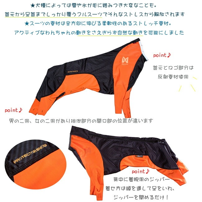 犬用スノーウエア。雪の中を走るアスリート犬達へ作られた、本格的なスノーウエア。動きやすさを追求した、全方向へのストレット素材。男の子用、女の子用がございます。