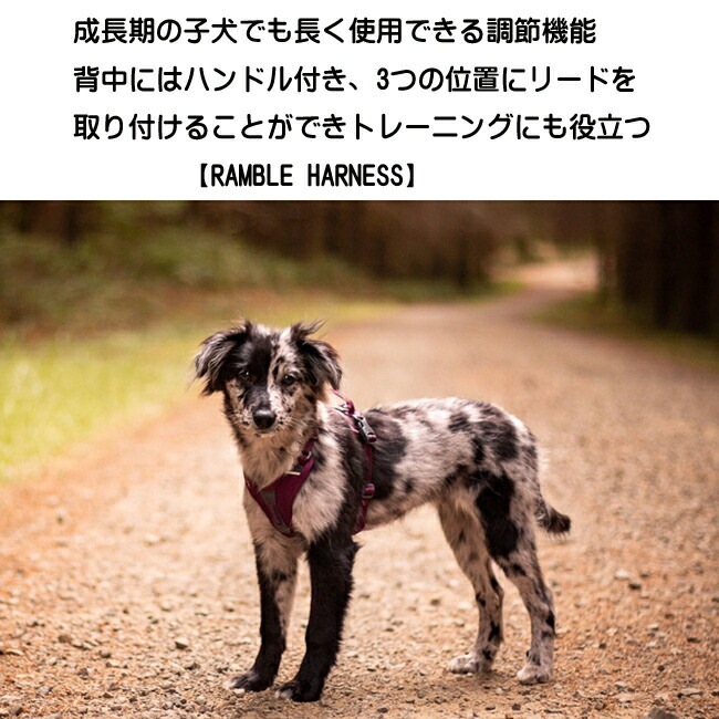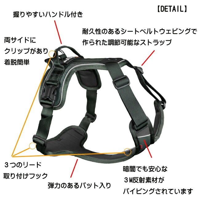 背中のハンドル、3つのリードフック、防水性、クッション性、広い調節機能で子犬の成長期も長い間使えるハーネスです。アウトドア、トレッキング、ハイキング、山登り、日常のお散歩にも使いやすいハーネス。