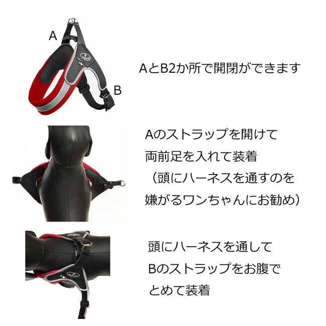 軽量でクッション性、通気性抜群な2重メッシュが優しくワンちゃんをホールドします。蓄光リフレクターテープ付きで暗くなってからの散歩も安心です